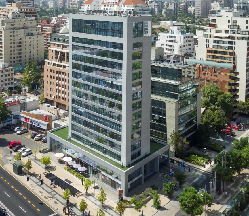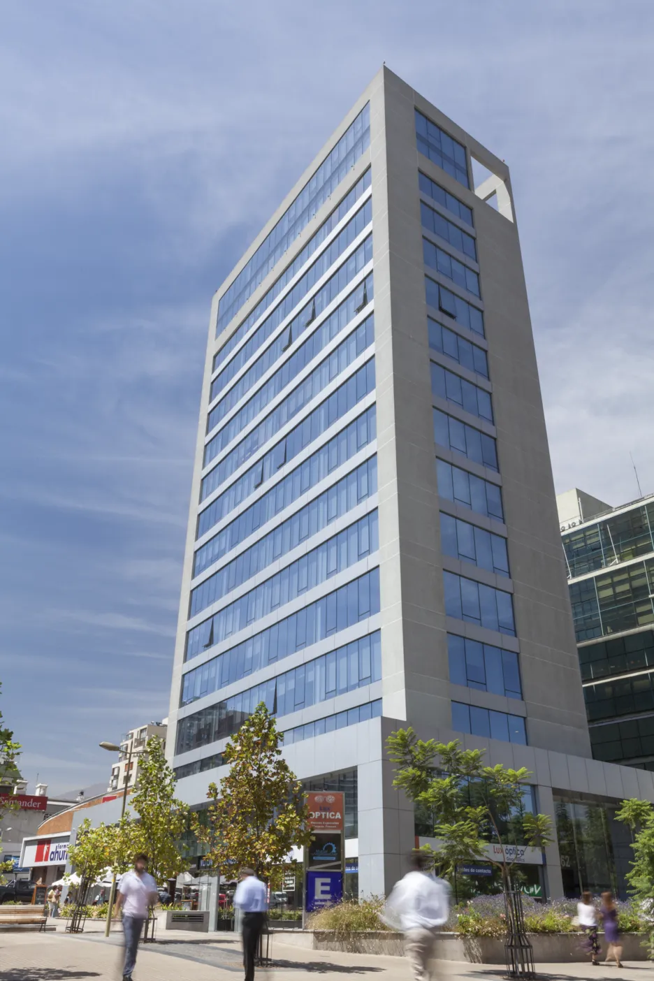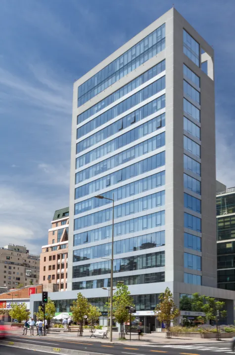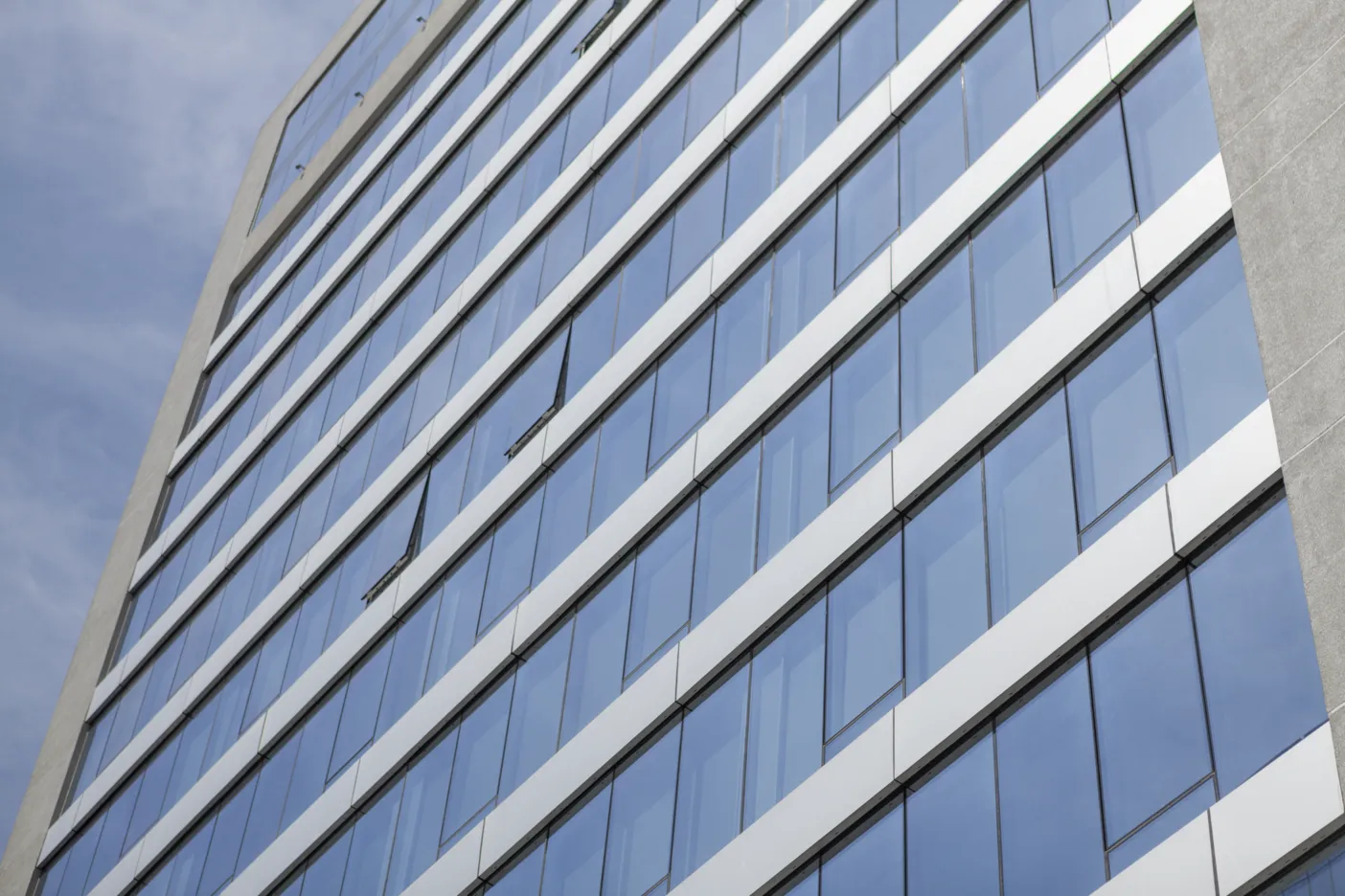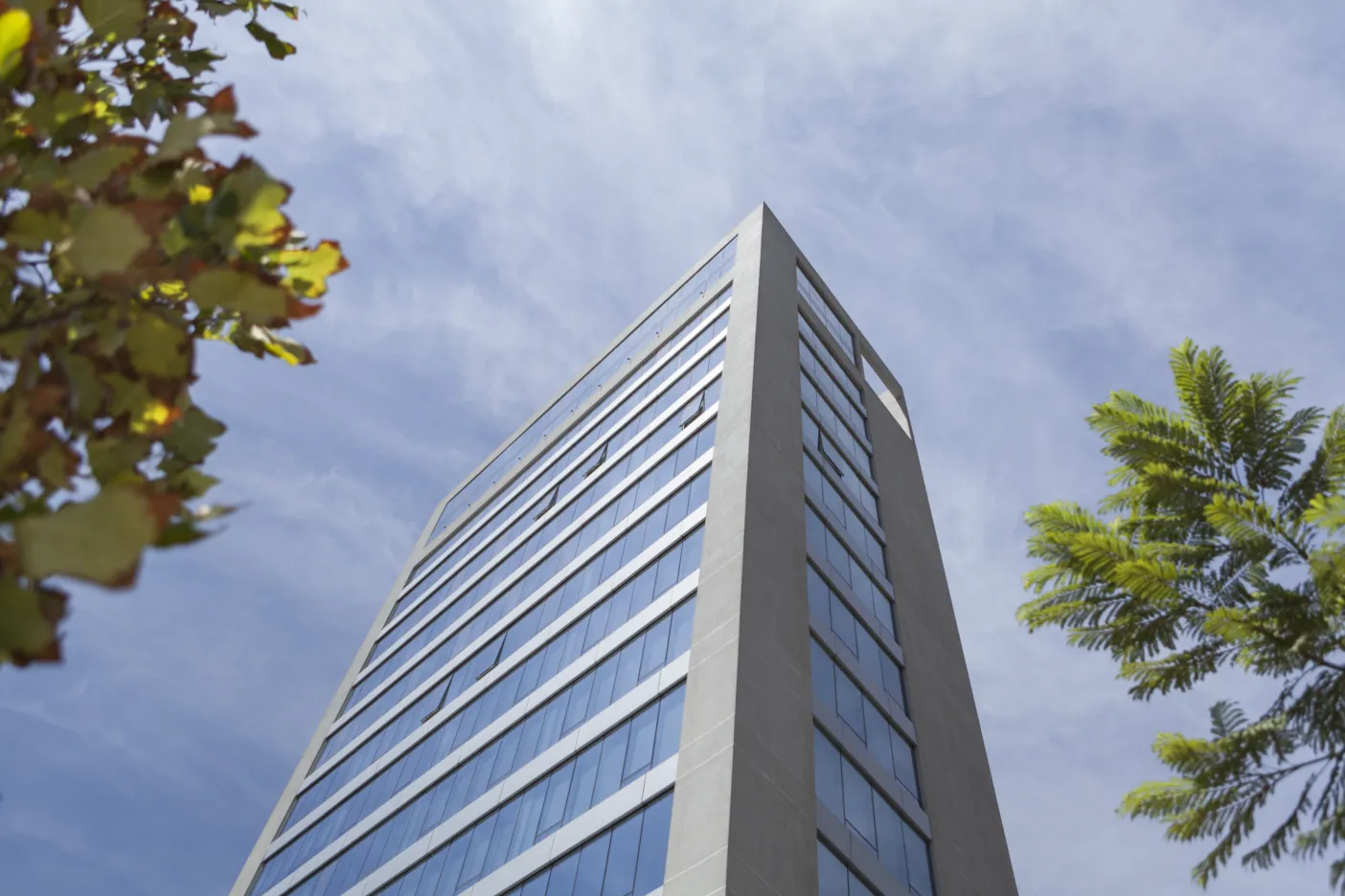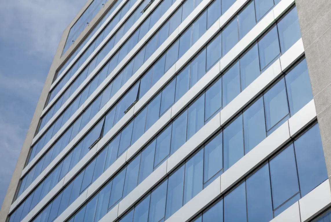PRODUCTOS: Muro Cortina Frame 100 tipo cinta Ventana, con revestimiento de ACM en antepechos y muros.